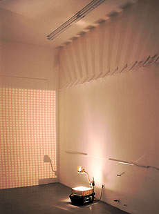 Bjørn: Ja, aber... ja klar, das ist ja genau dieser Moment von Vorplanung oder das, was aus der Aktion heraus entsteht. Ich meine, diese Erfahrung, dass du sagst, auch mit dem Raum, das sind ja Dinge, die lassen sich wahrscheinlich dann auch erst im Enstehungsprozeß wirklich entscheiden. Hannes: Na man hätte den einfach früher starten müssen. Also man hätte in die Räume gehen müssen und auch viel mehr Zeit verbringen müssen, also den simulieren oder so, diesen Prozess... Bjørn: Ja gut, aber ich meine, im Prinzip ist das ja so, daß man... Hannes: Ich meine, ein Theater mietet sich eine Probebühne, also ein reiches Theater, und baut da die Kulisse, also eine second-hand-Kulisse sozusagen, aber die Proportionen stimmen halbwegs, auf, und da wird geprobt, damit sie dann, weil auf der Hauptbühne spielt irgendwas en suite, d.h. da steht die Deko für ein anderes Stück rum, da können sie nicht rein, und dann haben die eine extra Bühne und dann... proben das, simulieren das in den richtigen räumlichen Dimensisionen und gehen dann auf die Hauptbühne und da fallen natürlich noch mal Entscheidungen. Sowas könnte man im Kunstbereich doch auch machen. Also letztendlich ist das ja nicht was großartig anderes. Also für mich hat das auch sehr viel mit Theater zu tun, mit Bühnenbild. Bjørn: Gut, aber ich meine, ja, letztendlich ist immer die Frage von der Größe einer Sache und das ist ja nicht nur... dass es wirklich viel um Planung geht und um Erfahrung eben auch. Und du musst durch diese ganzen Erfahrungen durch, um besser zu werden, auch im Umgang damit. Hannes: Das sowieso. Aber ich meine, rein theoretisch, wenn man ganz viel Geld hätte, könnte man sagen, man mietet sich einen Raum, der ungefähr diese Proportionen hat, oder man hat eine Halle und baut da einen Raum rein, der diese Proportionen hat, das ginge ja... und könnte dann da zwei Monate in diesem nachgebauten Raum die Erfahrung sammeln und das später in den Ausstellungsraum übertragen. Das ist eine Strategie wie Teams arbeiten, mit langen Vorläufen. Also ich meine, wir haben ja auch alleine gearbeitet. Bjørn: Mhm, mhm. Aber ich meine, trotzdem gibt es ja dieses... ich versuche das immer auch mit Filmproduktion zu vergleichen, das ist da, wo ich herkomme, also ich meine, du gehst... weil, die Ausstellung entsteht beim Drehen, letztendlich, also das ist eine Situation... Hannes: Jaähm (quengel)... Bjørn: Neenee. Also wenn du einen set irgendwie einrichtest, angenommen, du willst irgendwas drehen und diese Vorstellbarkeit, was, wie es aussehen könnte, und was muss ich vorher planen, damit es so wird, also damit die Idee, die grundsätzlich da ist, der Wirklichkeit, ehe es umgesetzt ist, am allernächsten kommt. Das ist ein Faktor, der da vor allem gilt, wenn du in sowas reingehst, weil du also jetzt besprechen wir mal so eine größere Produktion, weil du einen wahnsinnigen Apparat am Leiern hast? Hannes: Du hast aber auch Filmarchitekten, und du hast Leute, die wie heißen die, die so durch die Gegend kurven und dann... location scouts? Bjørn: Ja, location scouts. Ja klar, ich meine davon gehe ich jetzt erst mal nicht aus aber es muss ja trotzdem auch was mit den Schauspielern passieren und sowas. Es muß ja alles irgendwie zusammenkommen und es muß dann klappen! Es muss also soweit vorbereitet sein, dass es dann klappt an dem Tag, weil mit der Zeit geht es ja nicht, du kannst nicht deswegen noch mal mit der Probebühne du kannst jetzt nicht einfach sagen: gut, wir stellen jetzt hier mal... wir leuchten mal diesen Häuserblock für eine Woche aus, und probieren dann mal aus, wie wir am besten diese Szene spielen. (lacht) Hannes: Geht nicht, ja. Okay, und die Parallele jetzt zu der Ausstellung? Bjørn: Zu der Ausstellung: du hast... ich meine, man muß eben vorher... Hannes: Man muß ein Drehbuch haben, sozusagen, mit dem man dann ankommt, ja. Bjørn: Ja. Jaja. Und vielleicht, je größer die Sachen werden, desto wichtiger wird das Drehbuch. Hannes: Ja, und dann kommen halt irgendwelche blöden off-Leute, die sagen: wir wollen aber kein Drehbuch, wir wollen improvisieren! Wir sind so ganz spontan und locker! Bjørn: Ja, ich meine, wenn du sagen würdest, du fängst jetzt hier an, einen Film zu drehen, verballerst 10 Millionen Mark oder sowas, und sagst als Regisseur... Hannes: ...mal schauen, was rauskommt! (Lachen) Bjørn: Ich meine, es gibt ja solche Leute... Hannes: Gibt es auch, ja! Gab es schon, war oft ziemlich langweilig, manchmal ganz spannend. Kommerziell immer ein Mißerfolg! Bjørn: Eben, das geht ja alles. Also ich meine, das kann ja auch... gut, wenn du es als Konzept wieder machst, wie Schlingensief oder Lars von Trier oder sowas, kannst du das vielleicht auch dahingehenlassen(?). Aber letztendlich, glaube ich, und das ist halt mit der Größe, wo du sagtest: es ist für dich irgendwo ein Endpunkt damit angekommen... und vielleicht, ja, wenn du nicht, weil deine Arbeit besteht ja wirklich also aus diesem Pilz, der irgendwie in sowas reinwächst. Du gehst in den Raum und da ist der erste der Erreger drin, und dann irgendwann ist das alles befallen. Und das ist auch wichtig für deine Arbeit. Ist eigentlich nur die Frage, wie kompatibel ist sie mit dem Ausstellungsbetrieb (beide lachen), ab einem gewissen Level. Weil, du kannst das natürlich bei off-Räumen oder so... Hannes: ...geht das, jaja, klar. Bjørn: ...geht das, ja. Und vielleicht muss es ja auch nicht der große Raum sein. Hannes: Ist zwar ganz spaßig, aber muss nicht, nee. |