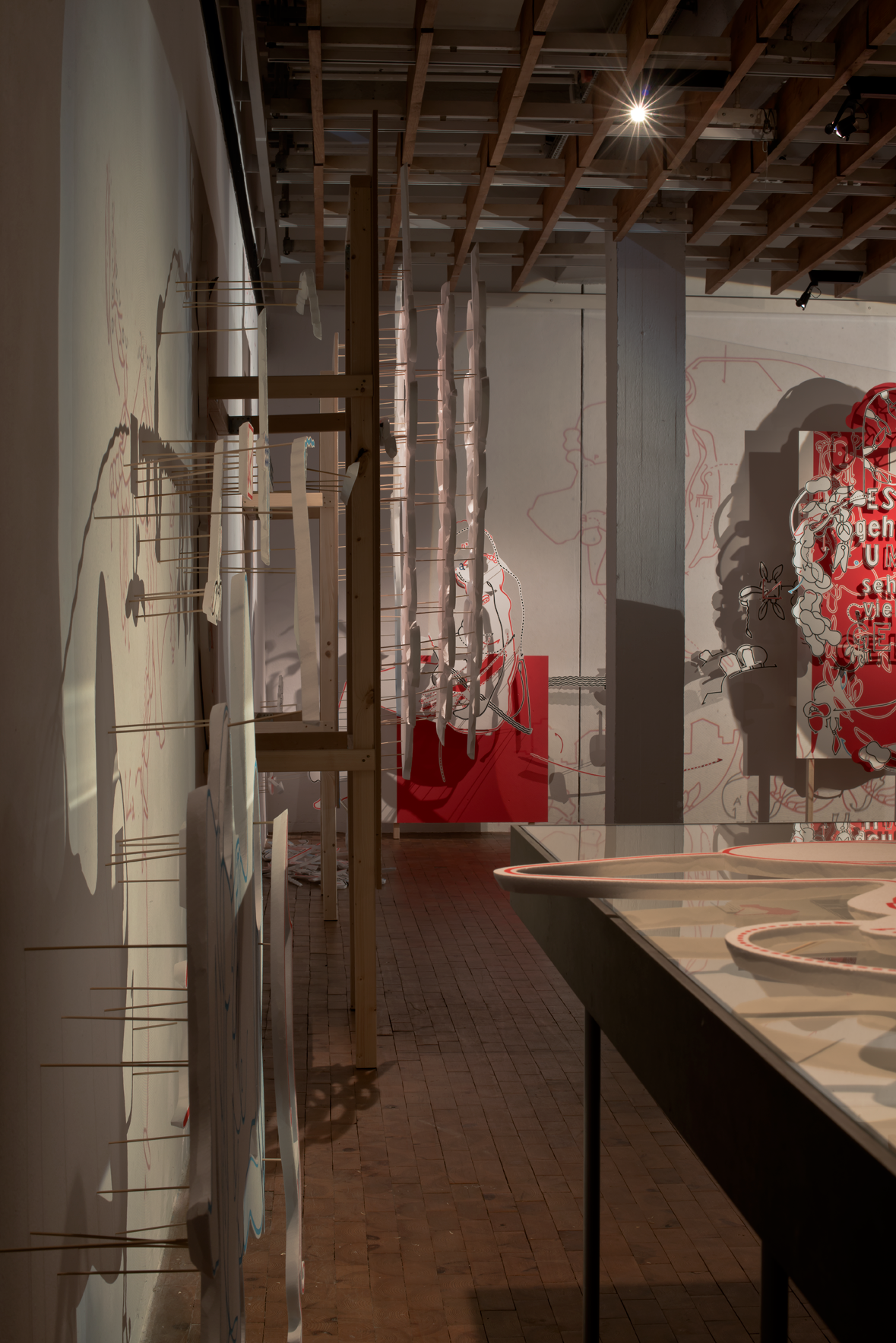 | Blick zurück auf Station 01 (mit Projektion) und Overheadprojektoren-Insel, links die Begrüßungstafel von hinten mit in ihr integrierten CD-Player (für eine Version des Sound-Loops) und einem Overheadprojektor. [Foto vom 06.10.2012] |