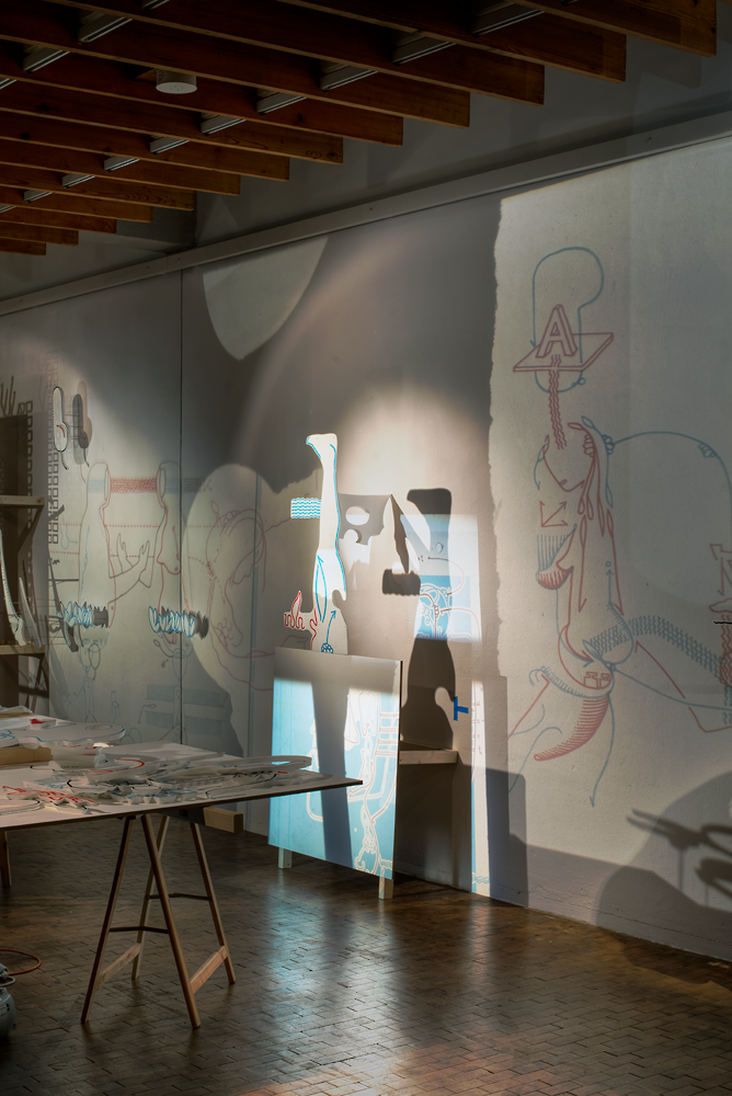 Der Tisch, bzw. was auf dem Tisch stattfinden sollte, war die in der Vorbereitung offenste Position das sollte sich während des Aufbaus und dann auch während der Ausstellung entwickeln und klären. So ist die Entscheidung für den Einsatz einer (dann auch abgewandelten) Karte des Hansaviertels erst 2 Wochen vor Ausstellungseröffnung gefallen und dann vor Ort umgesetzt worden. Auch während der Ausstellung war es die Position, die sich am meisten veränderte und weiterentwickelte. Zudem war der Tisch während der Laufzeit immer auch Ablagefläche für noch einzubauende Teile und Werkzeug und ab und an auch Arbeitstisch. |