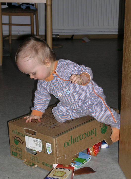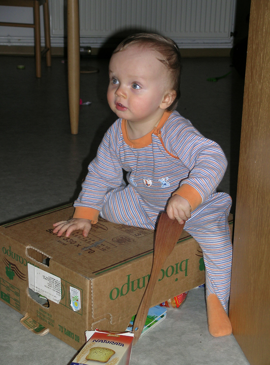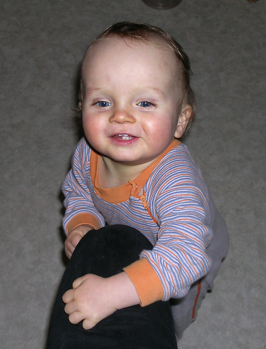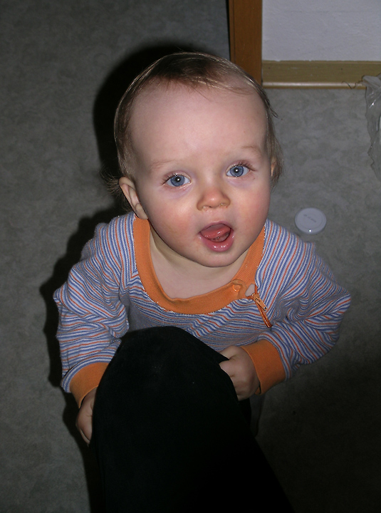 H. im Schlafanzug: ich will noch nicht ins Bett! (Dezember 2008, im Vordergrund mein Knie)